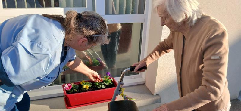 Les résidents de l'EHPAD profitent du soleil et des douces températures pour sortir se promener dans le jardin.