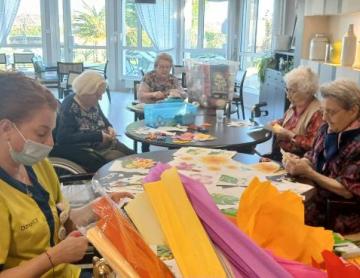 Les résidents de l'EHPAD des "Jardins de Creney" élaborent avec l'animatrice et les aides soignantes une décoration florale.